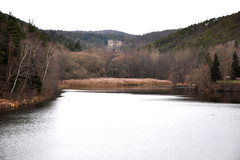 Der Stausee vor der  Ruine Kronsegg, an der Straße gelegen, wird im Sommer gerne von Badegästen besucht, die Wanderer umrunden den See das ganze Jahr.